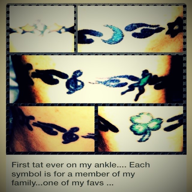 Boy do I remember white knuckling it and I remember it like it was yesterday. It was a knarly decision to make and all the worries associated with getting a tattoo for the first time were fresh in my psyche. Nowadays I cant wait for more! each ink charm on this anklet represents a member of my family and things that will never change. I designed it, it is on my right ankle and it opened for me the gates to a new path of self expression….