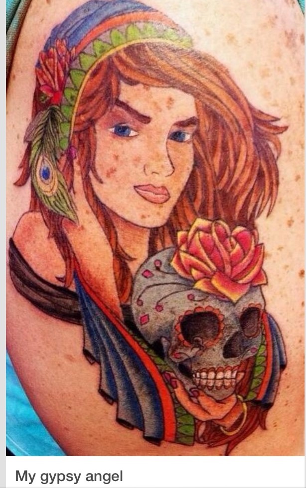My gypsy angel. This was a huge commitment because it took up half my right arm…yikes! Scary but amazing. I remember the artist’s face, Maria, a dear friend and total talent, when I told her how big I wanted it….Of course I got a gigantic thumbs up. I believe in spirit guides and guardian angels. I love skulls, spirituality, mysticism and beauty and boy did she deliver…I love my gypsy angel from the center of the earth to the cosmos….:)