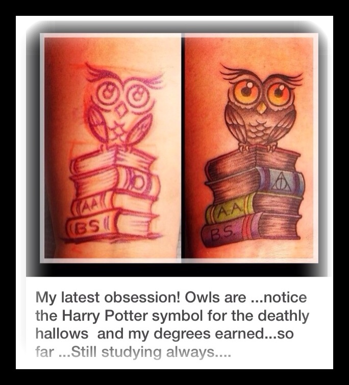 My latest obsession! The owl spirit animal is emblematic of a strong bond with wisdom and intuitive knowledge. I feel as though I have the ability to see what is usually hidden to most. It is a deep knowing in the gut if something rings true or not that can be a blessing and a curse all rolled into one. The owl represents the inspiration and guidance necessary to deeply explore the unknown and the magic of life. The Harry Potter reference needs no explain I’m sure (Deathly Hallows love people!) and the list of my degrees so far was a fun detail…I am forever a student of life, and I will be studying always…