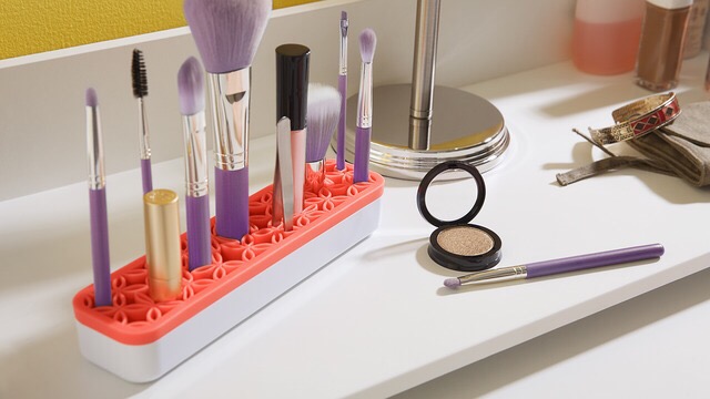 “Its grippy silicone base accommodates primping tools of varying sizes, from brushes to pencils to tweezers. It’ll keep…your counters clutter free.”-Zen Cosmetics